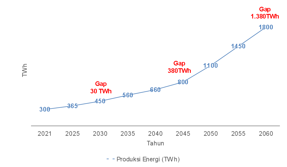 Produksi energi nasional pada 2024 mencapai 430 TWh, sementara proyeksi kebutuhan pada 2060 diperkirakan melonjak hingga 1.800 TWh.